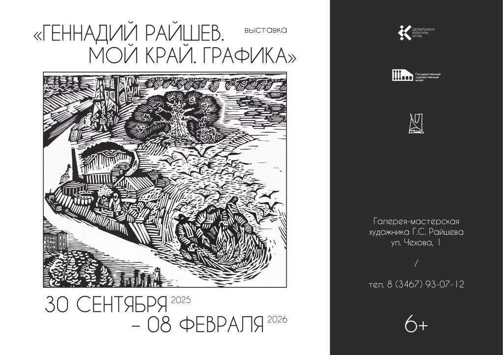 30 сентября в Галерее-мастерской художника Г.С. Райшева откроется выставка «Геннадий Райшев. Мой край. Графика». Экспозиция выставки представит произведения Геннадия Степановича Райшева в технике черно-белой и цветной линогравюры и офорта, созданные в период 1960-х – 1980-х годов и посвященные природе и людям сибирского Севера.