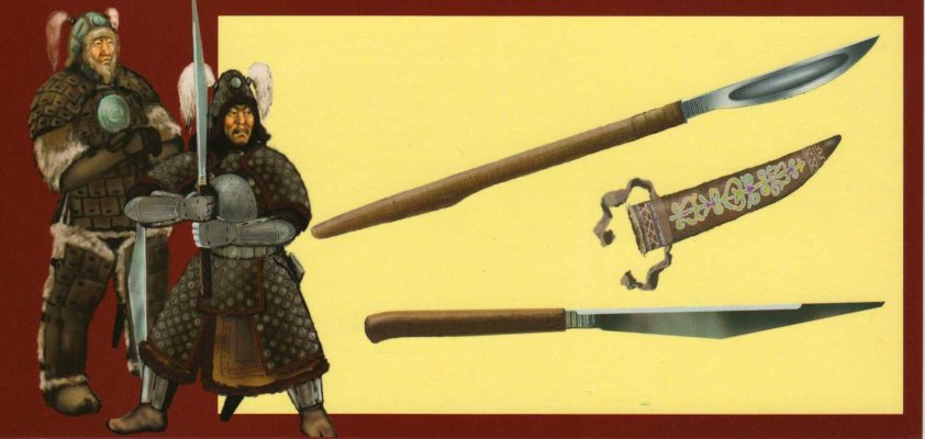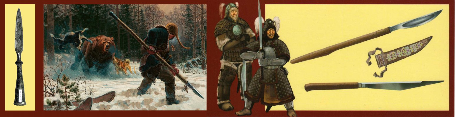 «Медвежье копье - рогатина, тоже очень простое: оно состоит из лезвия длиной до полутора четвертей аршина (26,67 см.), шириной 1-2 вершков (5-10 см.) Нижняя часть лезвия четырехгранная и заостренная, причем грани заершены снизу-вверх, этой частью его всаживают в древко, длиной около сажени, а чтобы последнее не расщеплялось, набивают на него железное кольцо. Лезвия и кольца заказывают русским кузнецам. У Парымского остяка, проживающего по Салыму имеется «пальма» тунгузской работы».