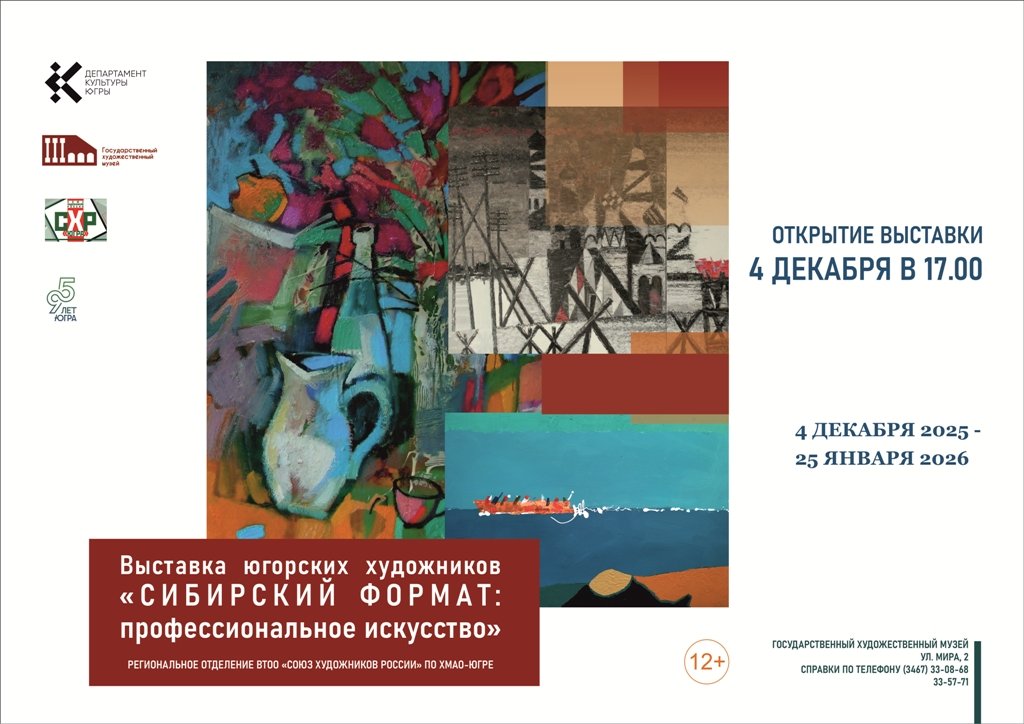 4 декабря 2025 года в Государственном художественном музее открывается масштабная выставка югорских художников «Сибирский формат: профессиональное искусство», приуроченная к 95-летнему юбилею Югры. Экспозиция представит более 70 произведений членов регионального отделения «Союза художников России» по Ханты-Мансийскому автономному округу – Югре, охватывая ключевые виды изобразительного искусства: живопись, графику, декоративно-прикладное искусство и скульптуру.