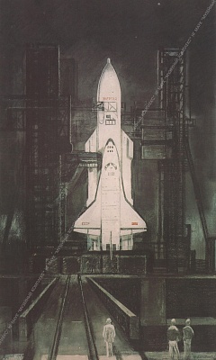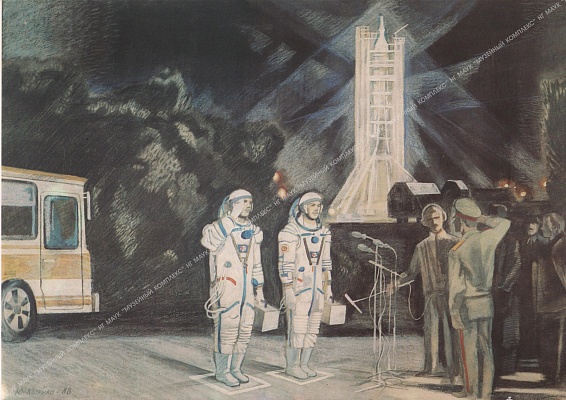 Сергей Павлович Королёв, великий конструктор, любил сопровождать ракету от монтажно-испытательного корпуса, где ее собирают и присоединяют к ней космический корабль, до стартовой площадки. Там она проходит последние испытания, заправляется горючим, принимает космонавтов и отправляет их на орбиту. Эти два километра пути Королёв проходил впереди медленно движущейся ракеты (это бывало обычно на рассвете) навстречу восходящему солнцу. Данный сюжет также представлен в подборке рисунков на планшете в виде коллажа.
